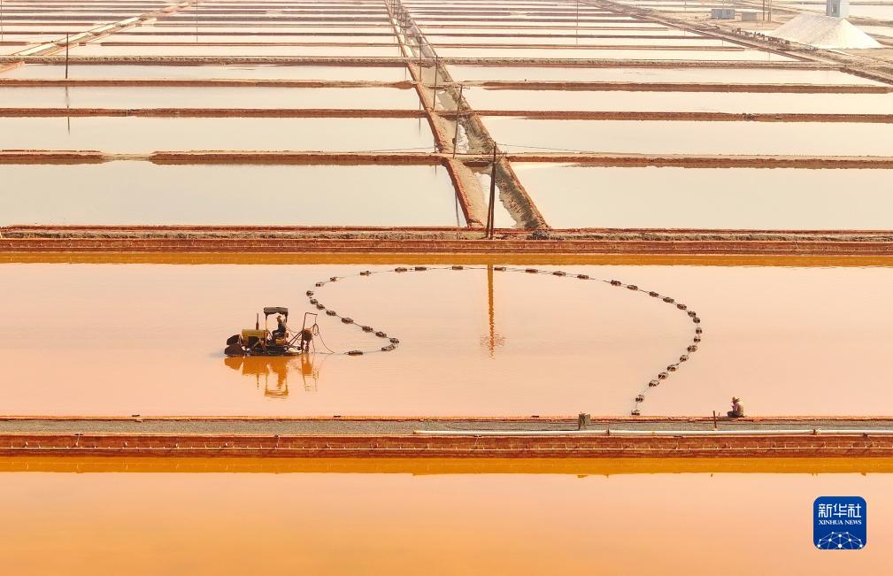 近日,河北省灤南縣鹽業生產企業,搶抓晴好天氣收獲秋鹽,鹽池內呈現出一派忙碌景象。據介紹,該縣鹽田面積達15000畝,年產原鹽達5萬多噸。
