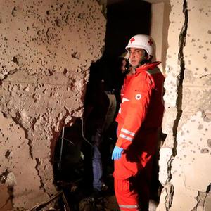 10月14日,在黎巴嫩南部薩巴阿鎮,救護人員來到遭以軍炮擊身亡的一對老夫婦家中。
