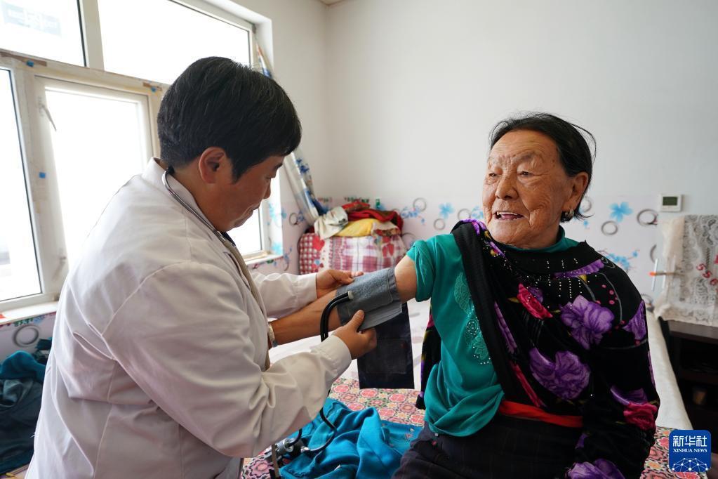 10月14日,醫護人員在河北省康保縣土城子鎮互助幸福院內為老人量血壓。