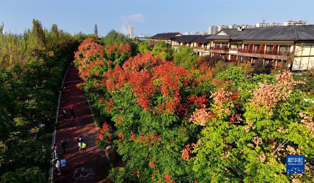 金秋時節,陜西西咸新區灃河兩岸秋意漸濃。暖陽下,斑斕的樹木,碧藍的晴空,巍峨的秦嶺,共同繪就出一幅絢爛秋景。