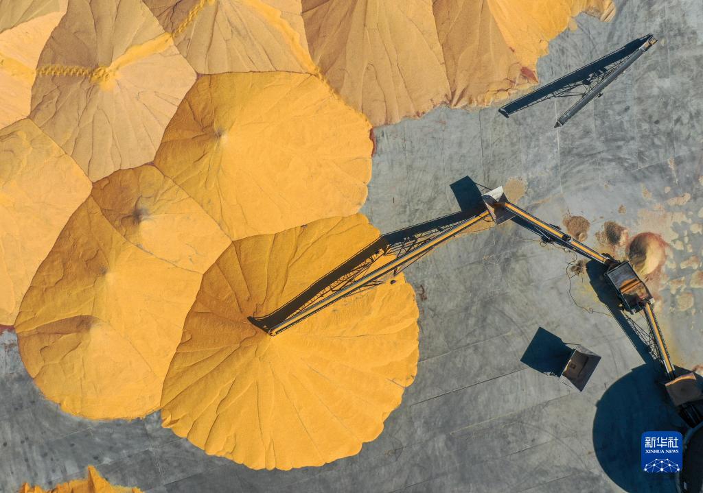 10月15日,在內(nèi)蒙古通遼市科爾沁左翼中旗腰林毛都鎮(zhèn)一家“糧食銀行”,經(jīng)過烘干的玉米堆積如山(無人機(jī)照片)。