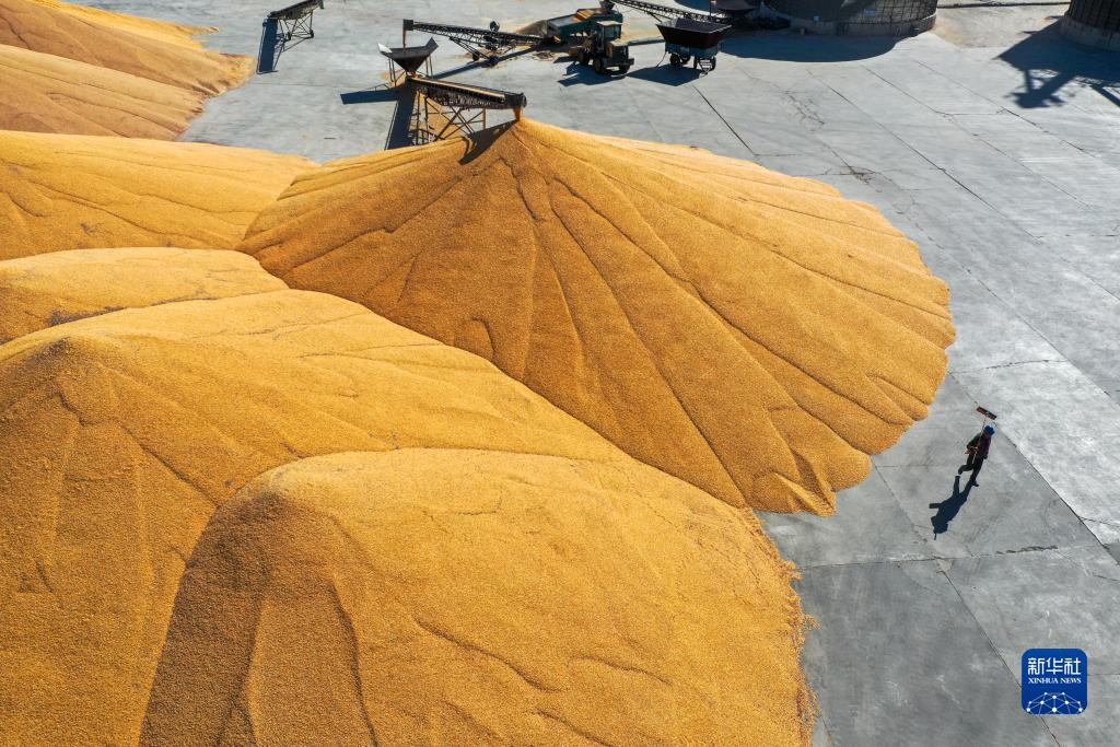10月15日,在內蒙古通遼市科爾沁左翼中旗腰林毛都鎮一家“糧食銀行”,工人走在烘干后的玉米堆前(無人機照片)。