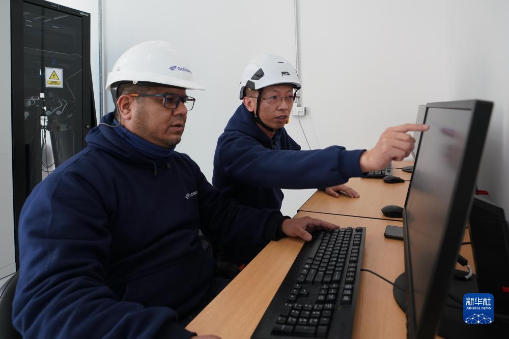 6月12日,在阿根廷丘布特省馬德林港的羅馬布蘭卡一期風電場,項目工程師馬列(右)與當地工作人員檢查風機運行狀況。