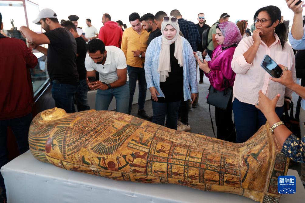 10月15日,在埃及明亞省考古現(xiàn)場,人們參觀彩繪木乃伊棺槨。