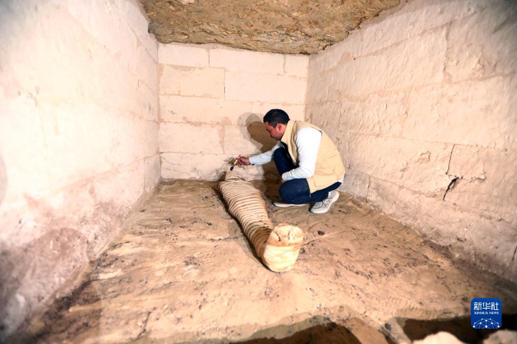 10月15日,在埃及明亞省考古現(xiàn)場(chǎng),考古人員清理一座石鑿墓中的木乃伊。
