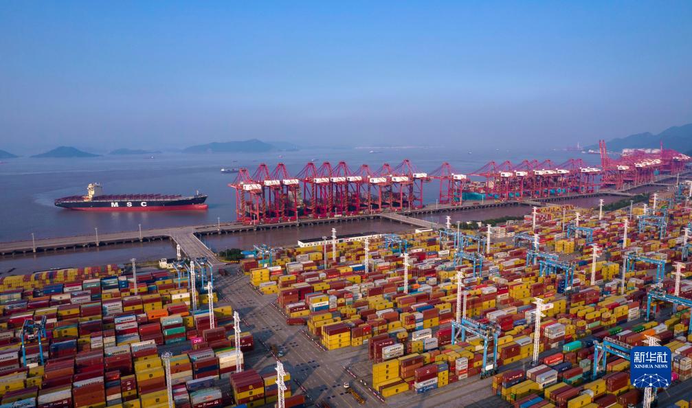 10月15日,一艘貨輪準備停靠浙江寧波舟山港穿山港區集裝箱碼頭(無人機照片)。