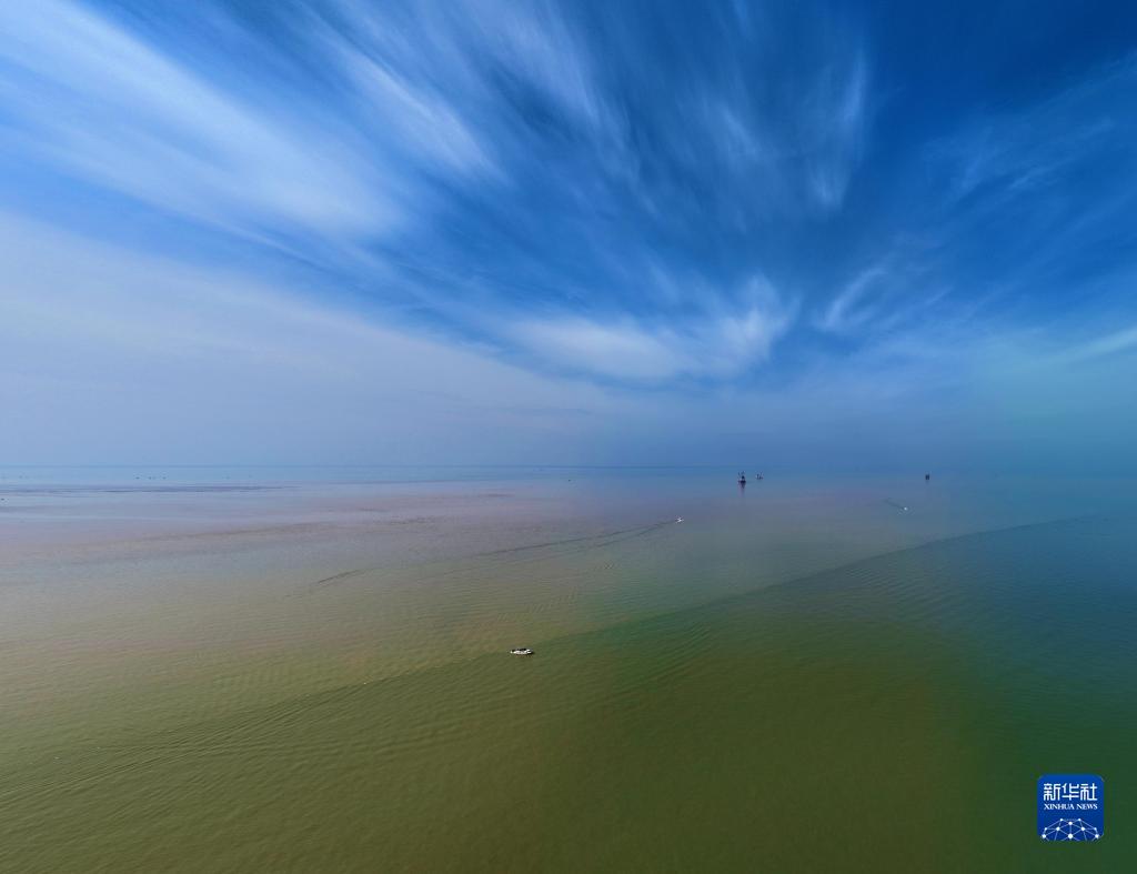 在山東省東營市黃河入海口,黃河匯入渤海。黃色的河水和藍色的海水之間形成了一條“分界線”,河黃海清,涇渭分明。