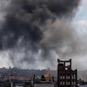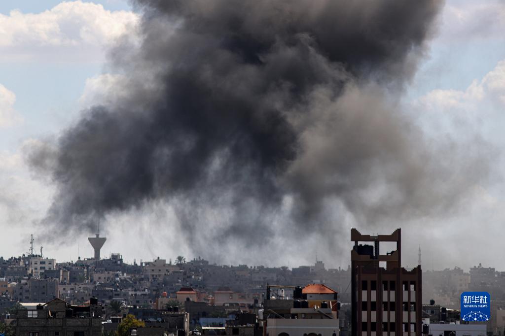 10月15日,加沙地帶南部城市汗尤尼斯的建筑遭以色列軍隊(duì)空襲后升起濃煙。