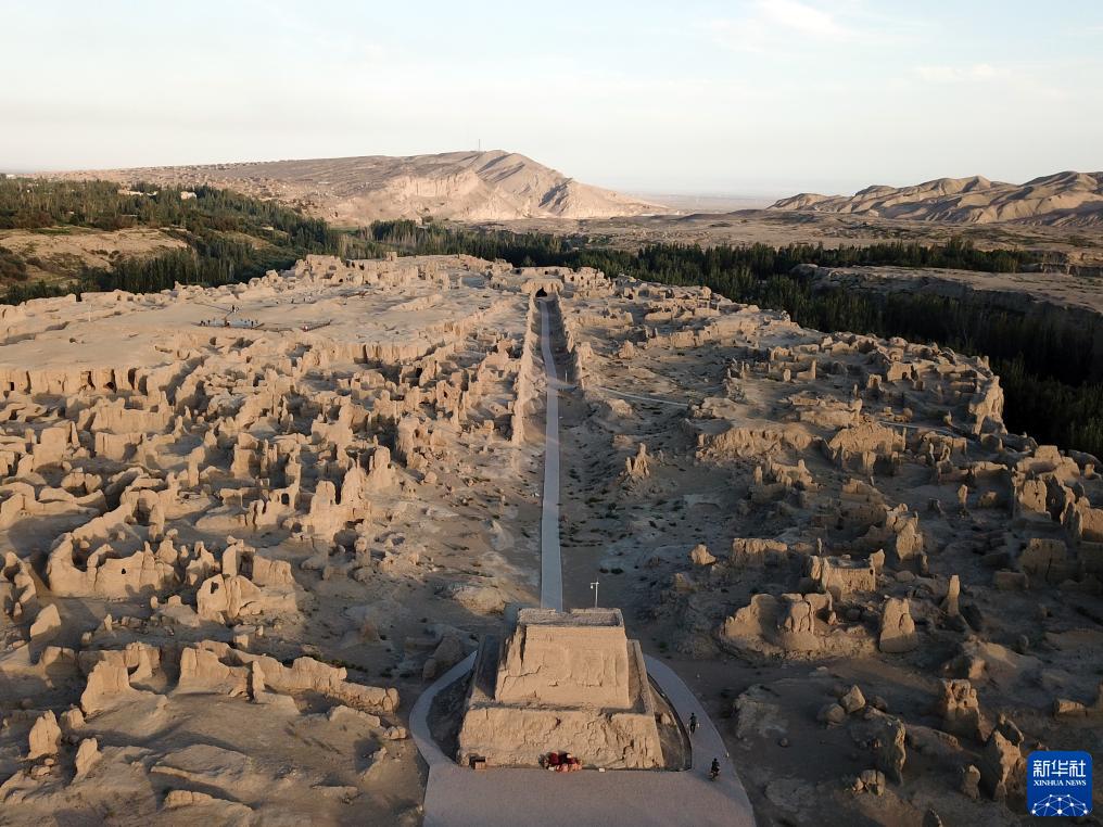 8月11日拍攝的夕陽(yáng)下的新疆交河故城(無(wú)人機(jī)照片)。