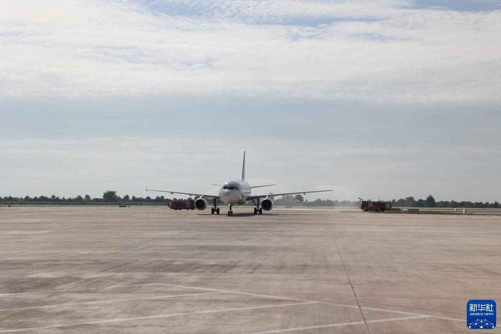 10月16日,在柬埔寨暹粒吳哥國際機場,首架進港客機降落后通過水門。