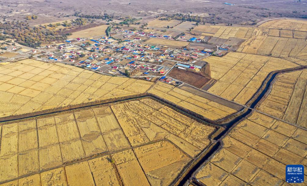 通遼市科爾沁左翼后旗金寶屯鎮(zhèn)套布海村水稻收獲過半(10月14日攝,無人機(jī)照片)。