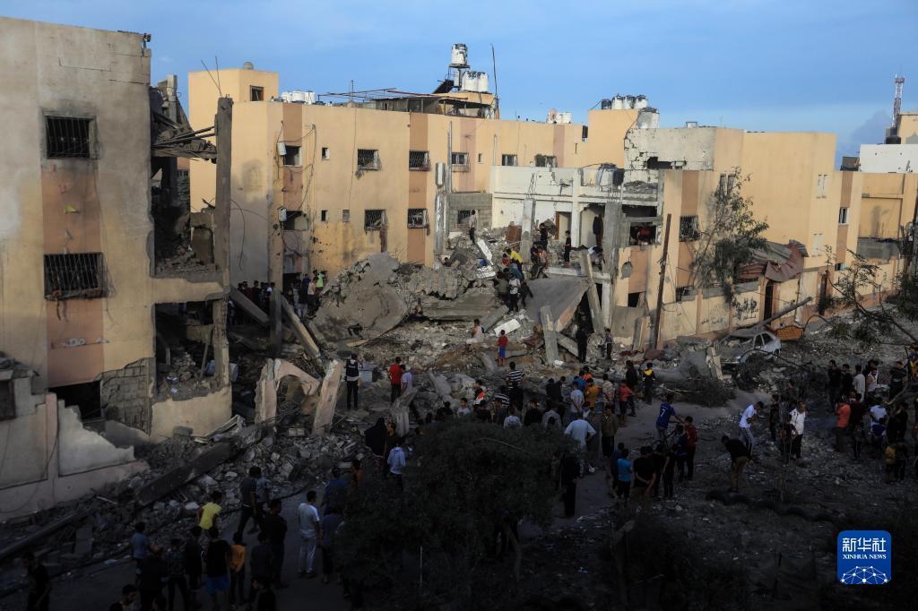 10月17日,在加沙地帶南部城市汗尤尼斯,人們在遭以色列襲擊損毀的建筑中實施救援。
