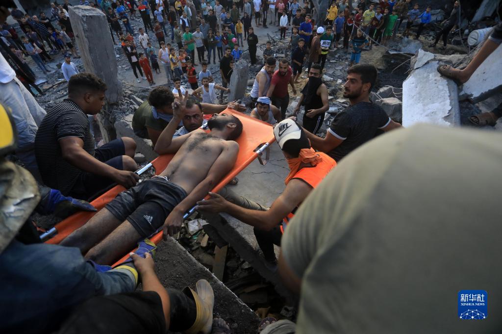 10月17日,在加沙地帶南部城市汗尤尼斯,人們在遭以色列襲擊損毀的建筑中實施救援。