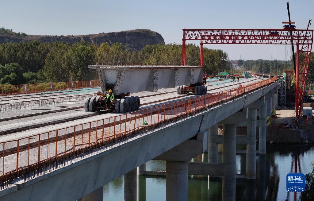 10月17日,工人在唐山灤州市內的秦唐高速公路跨灤河大橋建設工地施工(無人機照片)。