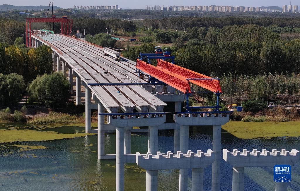 10月17日,工人在唐山灤州市內的秦唐高速公路跨灤河大橋建設工地施工(無人機照片)。
