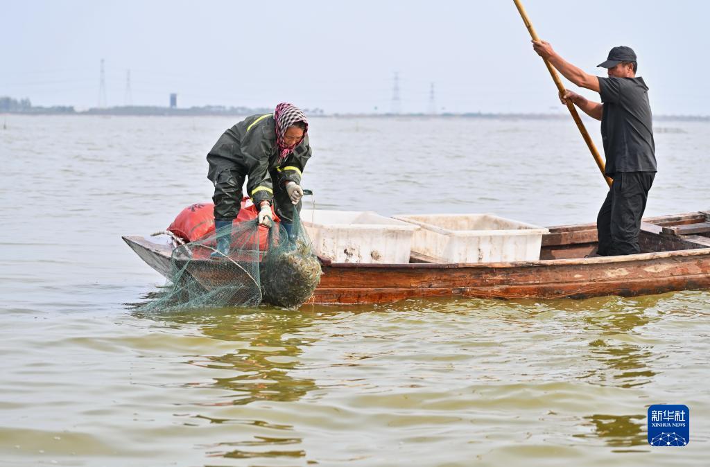 10月17日,在河北省唐山市曹妃甸區,水產養殖戶在捕撈利用鹽場鹽田鹵水養殖的南美白對蝦。
