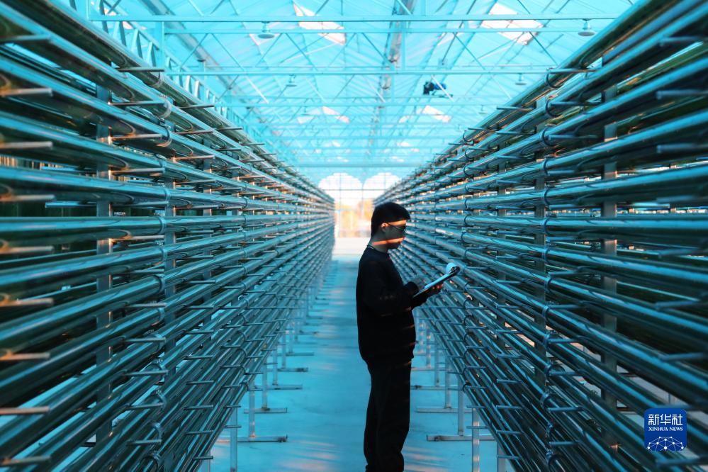 10月17日,園區工作人員在查看管道式養殖的螺旋藻情況。