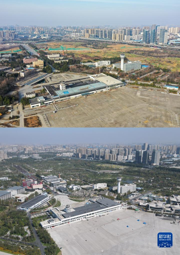 這是一張拼版照片:上圖為2021年2月9日拍攝的已停用的合肥駱崗機場(無人機照片,新華社發 黃洋洋攝);下圖為2023年10月17日拍攝的合肥駱崗公園(無人機照片,新華社記者周牧攝)。