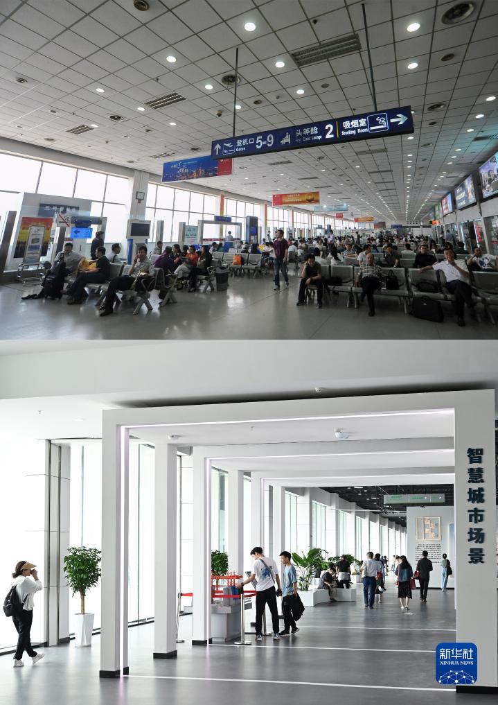 這是一張拼版照片:上圖為2013年5月24日,旅客在合肥駱崗機場候機樓內候機(新華社發 黃洋洋攝);下圖為2023年9月27日,游客在合肥駱崗公園內的城市建設館參觀,該館由原合肥駱崗機場候機樓改造而成(新華社記者周牧攝)。