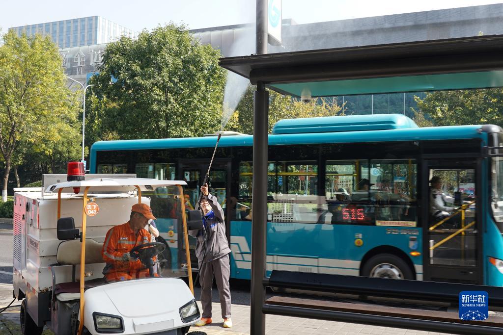 10月17日,保潔人員在清理公交站臺。