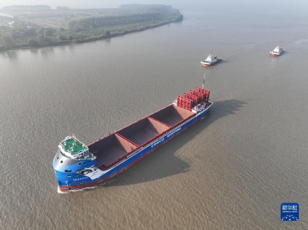 10月18日,中遠海運萬噸級電動集裝箱船在長江試航(無人機照片)。