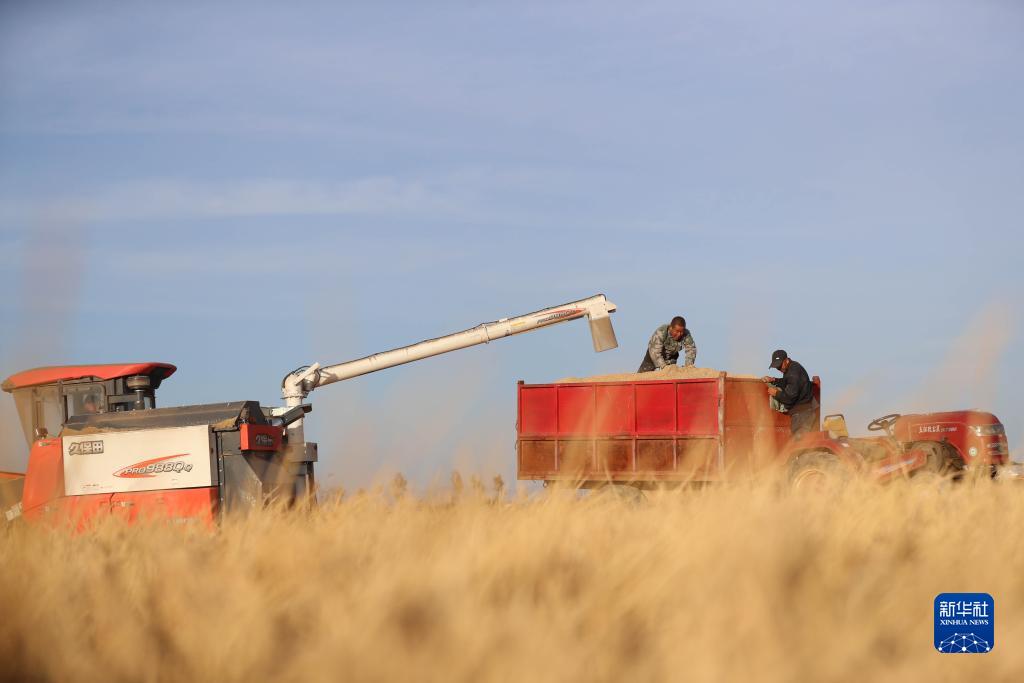 10月18日,在鄂爾多斯市達拉特旗昭君鎮沙圪堵村,農民將水稻裝入運糧車。
