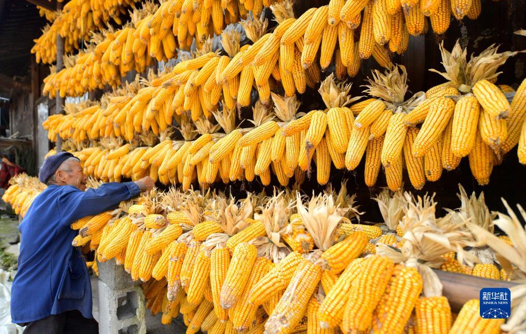 10月18日,湖北省宣恩縣李家河鎮回龍村農民在房前晾玉米。