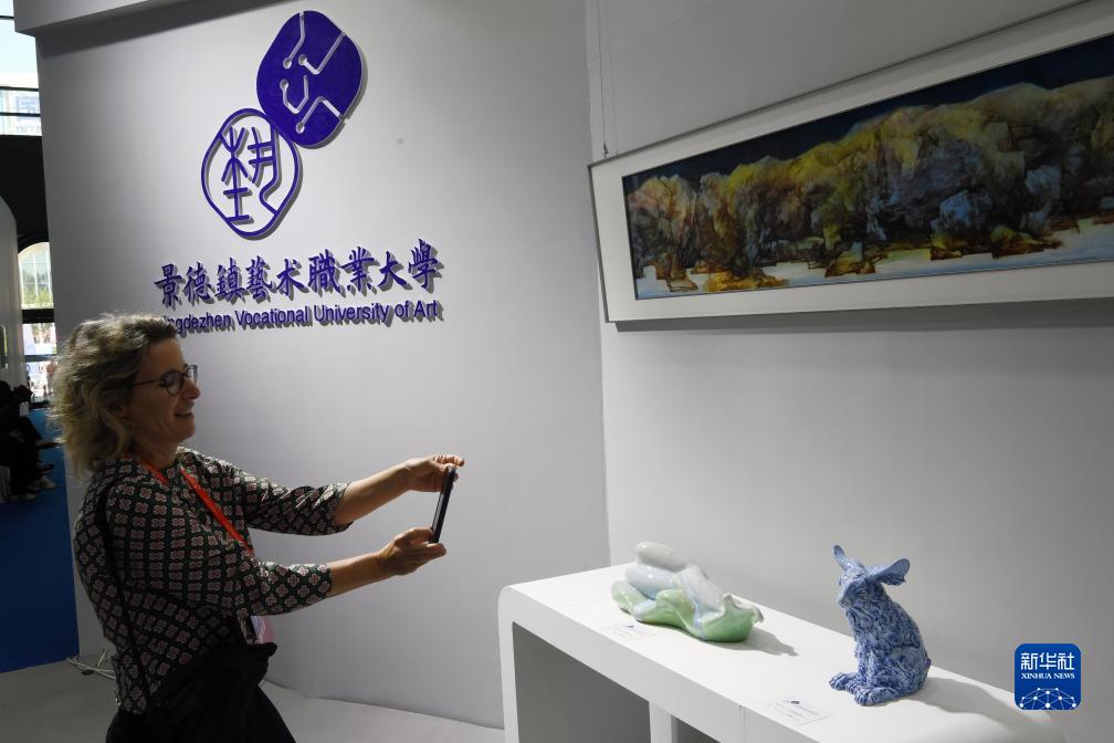 10月18日,一名外國參觀者在瓷博會高校展區拍攝陶瓷藝術品。
