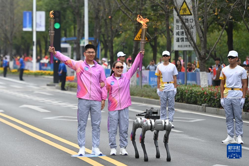 10月19日,火炬手葉昌煒(左)、蔡瓊卉在火炬?zhèn)鬟f中。