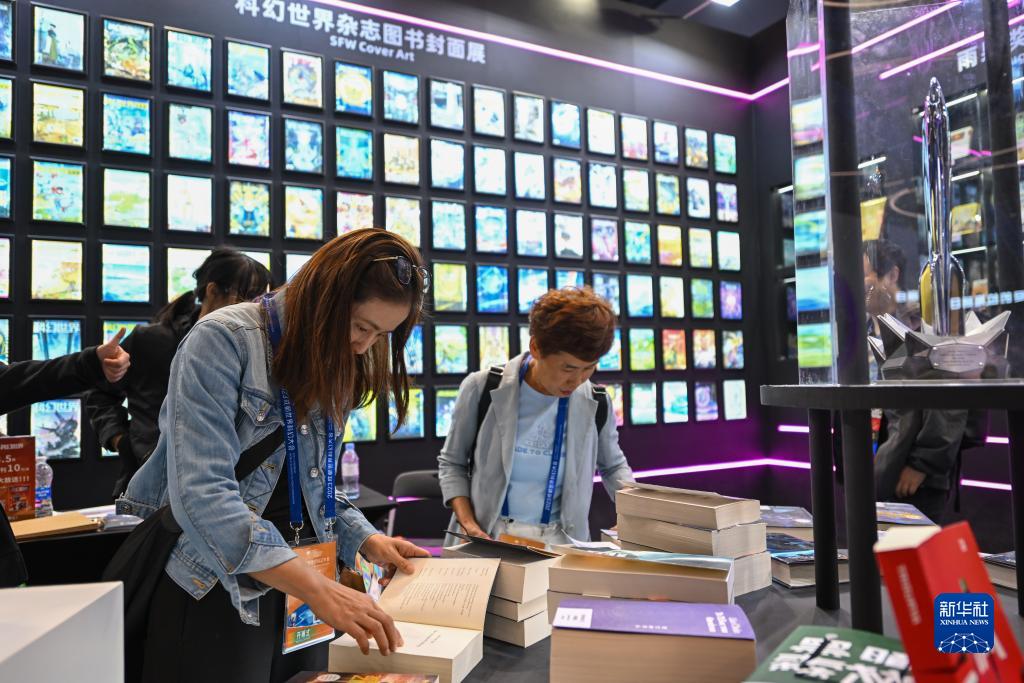 10月18日,觀眾在2023成都世界科幻大會主題展覽上挑選科幻書籍。