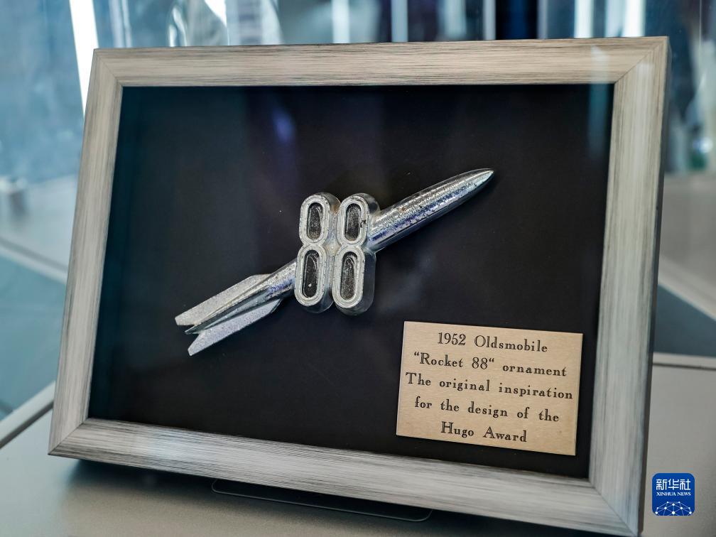 這是10月18日在2023成都世界科幻大會主題展覽上拍攝的1952奧茲莫比爾“火箭88”汽車裝飾品。