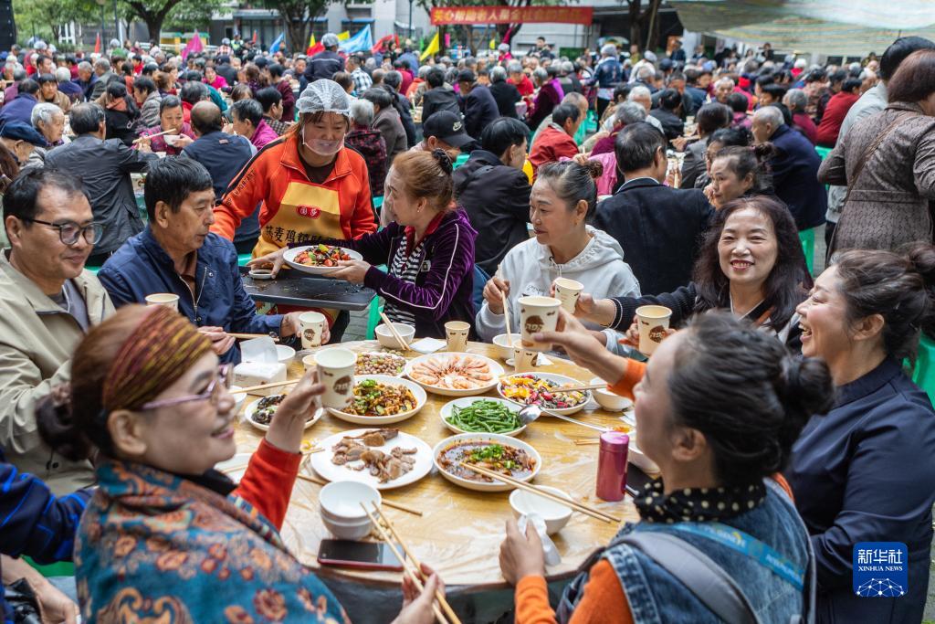 重陽節前夕,重慶市九龍坡區華巖鎮石龍社區開展“九九重陽節 濃濃敬老情”主題活動。600余位年滿60歲以上的社區老人共享“長壽宴”,在歡聲笑語中迎接即將到來的重陽節。