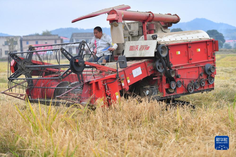 10月19日,在湖南省湘潭市雨湖區(qū)鶴嶺鎮(zhèn)晶鑫村,農(nóng)戶駕駛農(nóng)機(jī)在農(nóng)田里收割水稻。