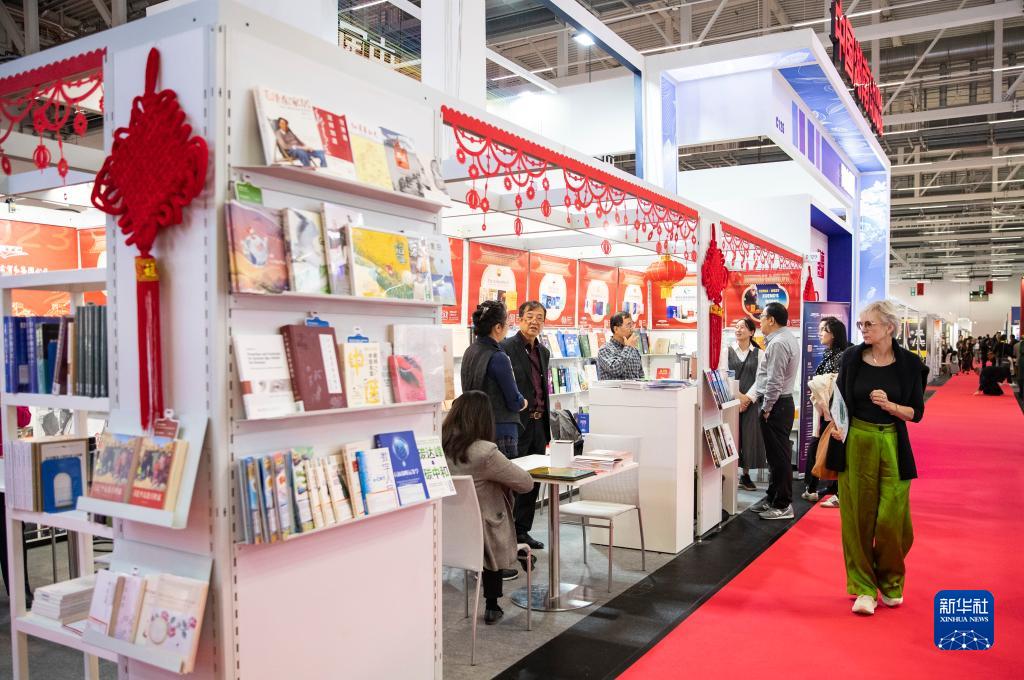 10月19日,一名參觀者走過德國法蘭克福書展中國展區(qū)。