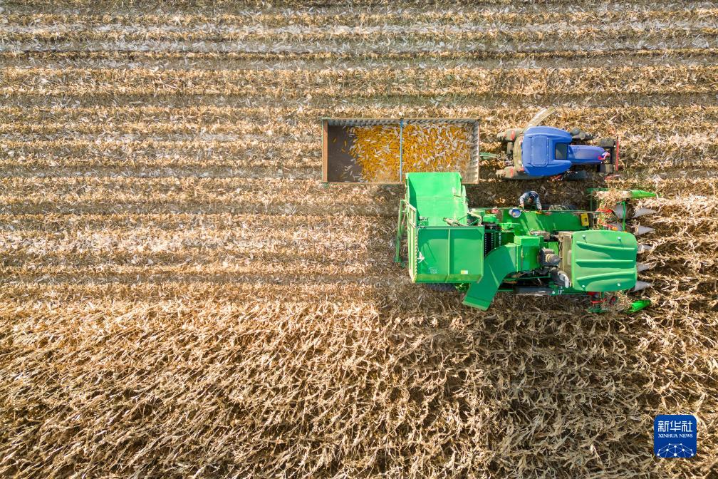 10月19日,收割機在齊齊哈爾市甘南縣中興鄉綠化村的一處玉米地收獲玉米(無人機照片)。