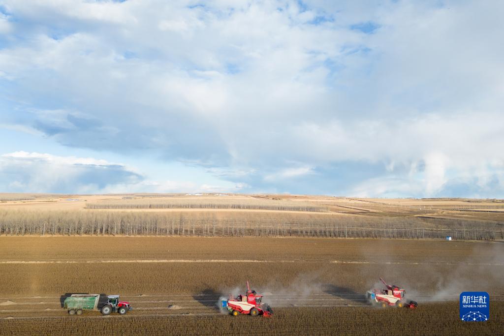 10月19日,收割機在齊齊哈爾市甘南縣中興鄉(xiāng)綠化村的一處大豆地收獲大豆(無人機照片)。