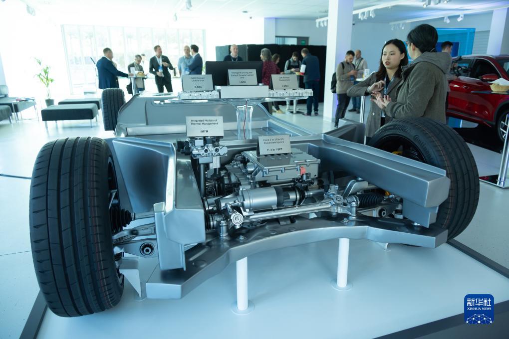 這是10月17日在匈牙利布達(dá)佩斯拍攝的比亞迪電動汽車底盤系統(tǒng)。