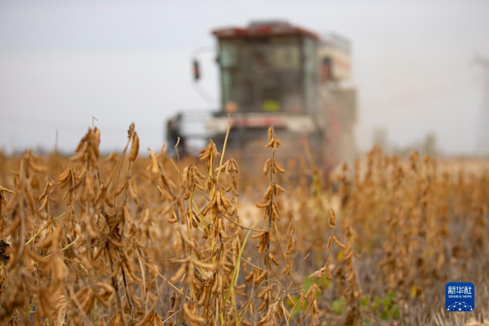 10月19日,在山東省東營(yíng)市廣饒縣李鵲鎮(zhèn)西張莊村玉米大豆帶狀復(fù)合種植田里,農(nóng)民駕駛收割機(jī)收獲大豆。
