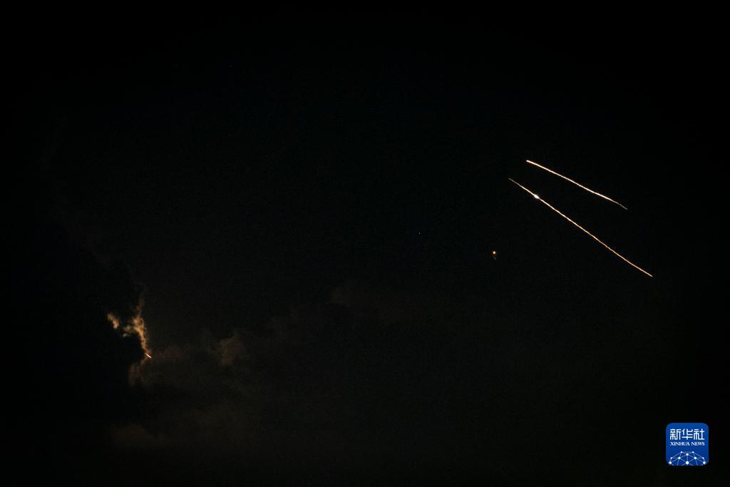 這是10月19日在加沙邊境以色列一側(cè)拍攝的夜空中的火箭彈軌跡。