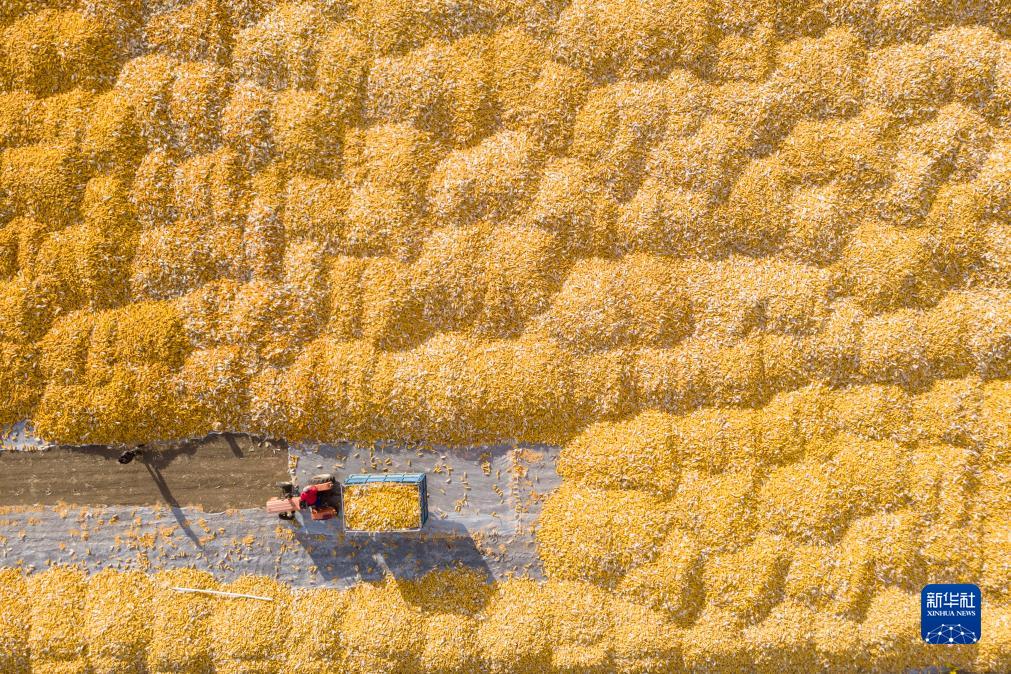 10月19日,在黑龍江省肇東市五里明鎮(zhèn)東升村,農(nóng)民把收獲的玉米運(yùn)到當(dāng)?shù)剞r(nóng)業(yè)合作社指定的地點(diǎn)進(jìn)行晾曬(無人機(jī)照片)。
