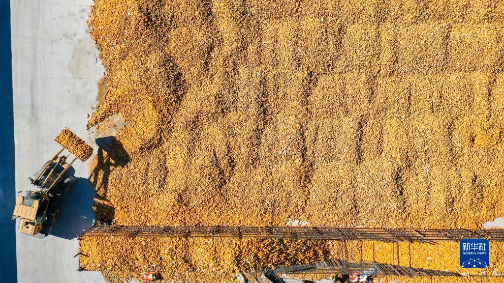 10月19日,在吉林省公主嶺市友忠種植農民專業合作社,農民將收獲的玉米放入科學儲糧倉(無人機照片)。