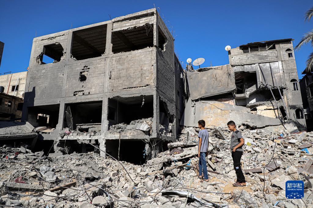 10月20日,在加沙地帶南部城市汗尤尼斯,男孩站在遭以色列襲擊損毀的建筑中。
