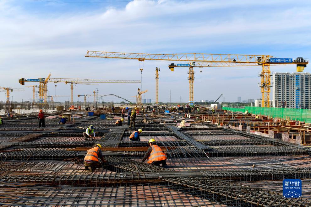 10月21日,在濟南地鐵6號線位里莊車輛段,中鐵一局的工作人員在進行主體蓋板施工(無人機照片)。