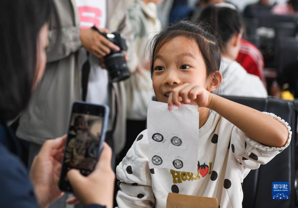 10月21日,一名小朋友向家長展示她制作的銅錢拓片。