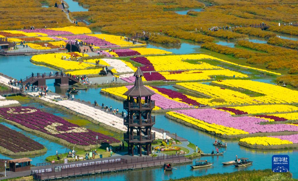 10月21日,游客在江蘇省興化市千垛景區(qū)賞菊游玩(無人機(jī)照片)。
