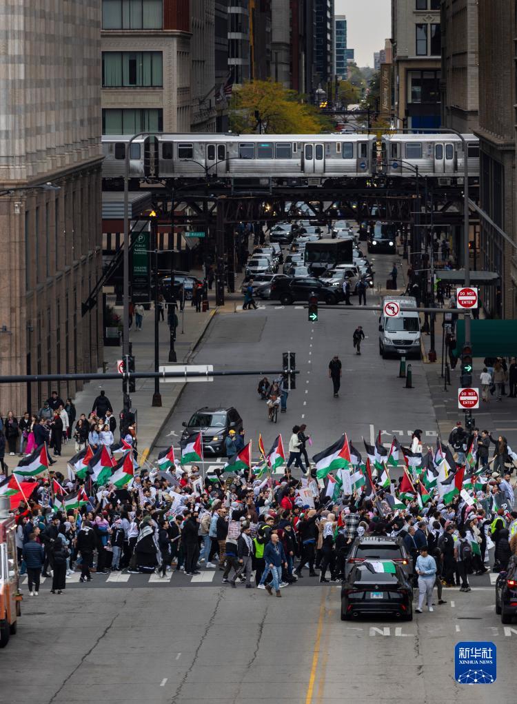 10月21日,在美國芝加哥,人們參加聲援巴勒斯坦的游行。