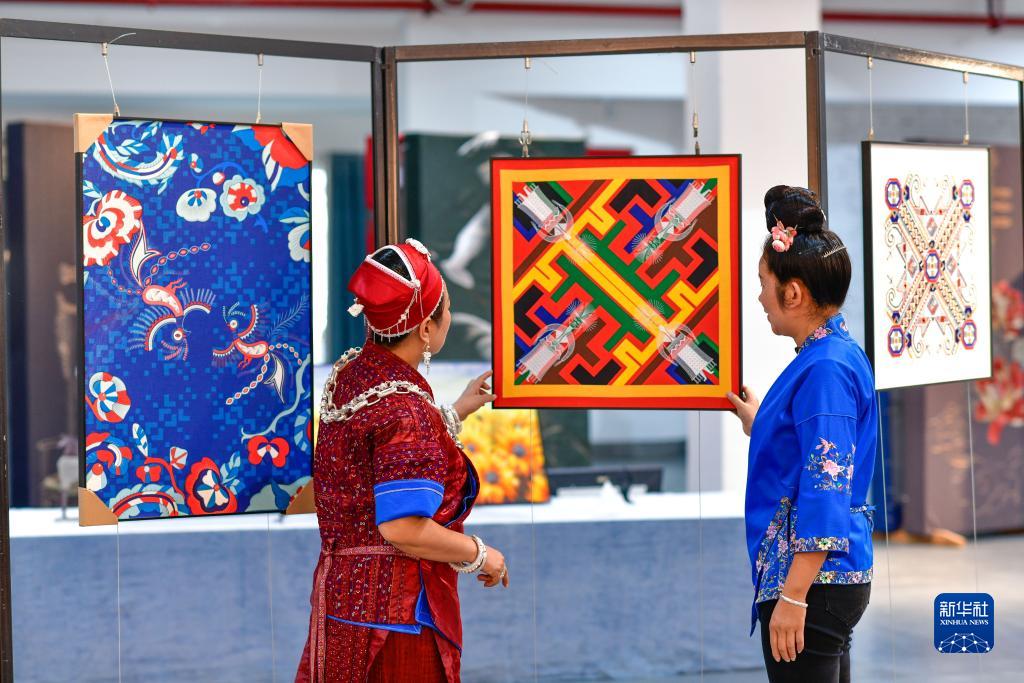 龍祿穎(左)與公司員工在苗繡產品數字化云生產車間查看刺繡室內裝飾畫(10月18日攝)。