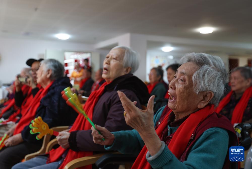 10月22日,在金煦福武侯萬(wàn)壽頤養(yǎng)中心,老人們?cè)谖髂辖煌ù髮W(xué)數(shù)學(xué)學(xué)院青年志愿者的帶領(lǐng)下唱歌。