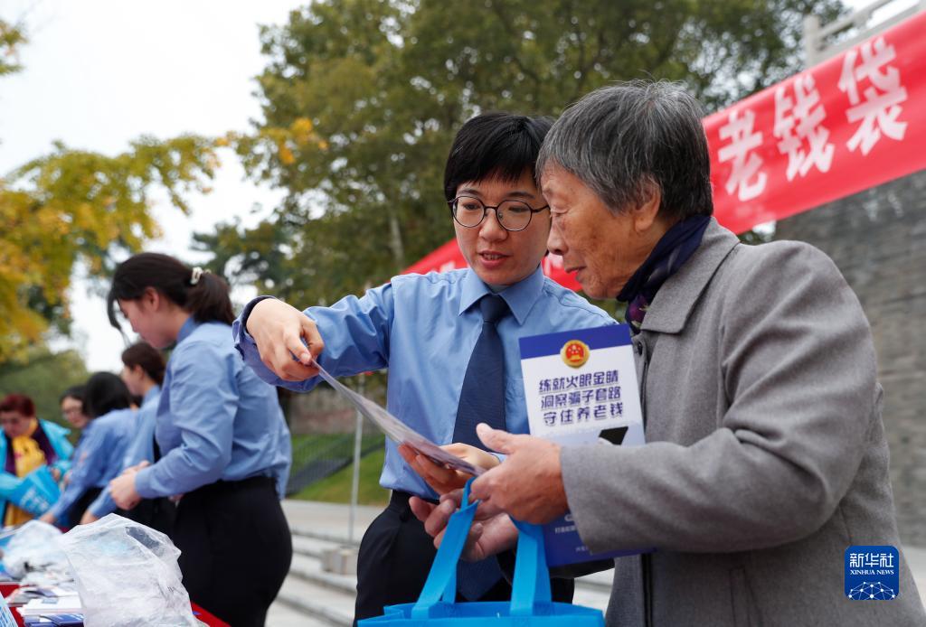 10月22日,江蘇省興化市人民檢察院法治宣講團的工作人員在公園向老年人講解反詐騙知識。