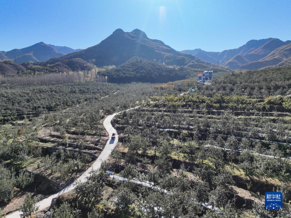 10月22日,在承德縣八家鄉(xiāng)深水河村一處標(biāo)準(zhǔn)化蘋果種植基地,農(nóng)民在運(yùn)送國(guó)光蘋果(無(wú)人機(jī)照片)。